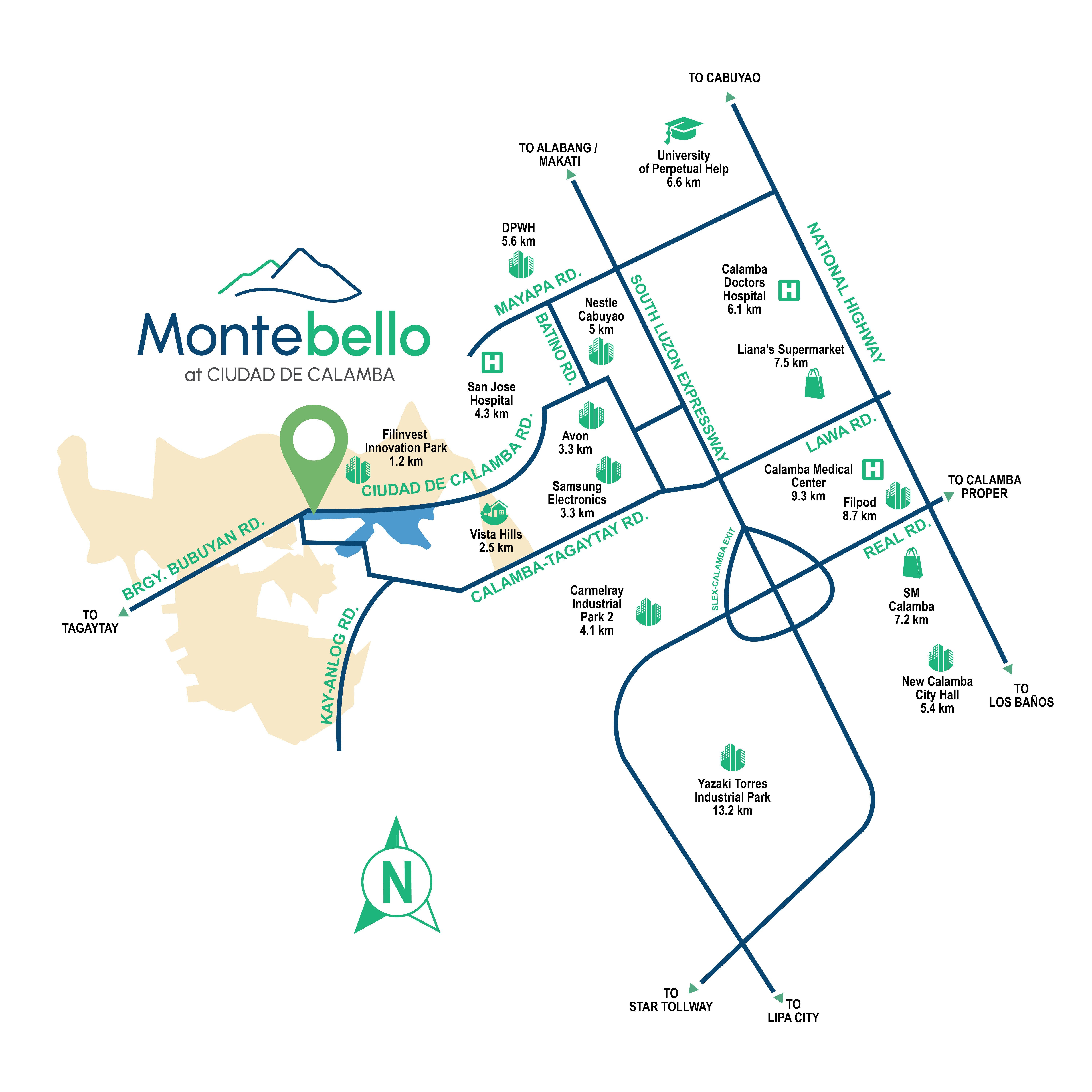 Montebello is located within the 350-hectare Ciudad de Calamba township in Brgy. Punta, Calamba, Laguna. It can be easily accessed from the four major areas of Luzon – Calamba, Batangas, Tagaytay and Manila. It is a 15-minute drive from Calamba City proper and a 1.5-hour drive from Manila via the Batino Exit of the South Luzon Expressway.